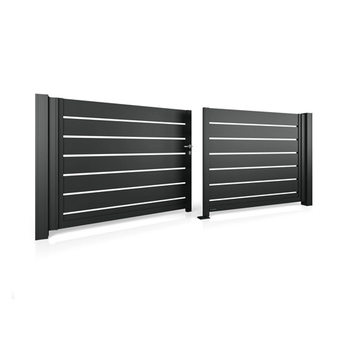 – robust aufgebaute zweiflügelige Tore, die mithilfe von Montageplatten an Systempfosten aus Aluminium oder am Mauerwerk montiert werden