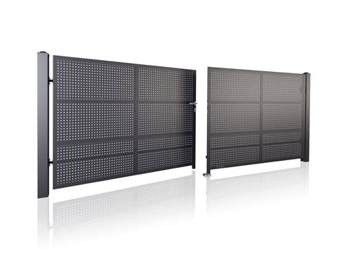 – robust aufgebaute zweiflügelige Tore, die mithilfe von Montageplatten an Systempfosten aus Stahl oder am Mauerwerk montiert werden